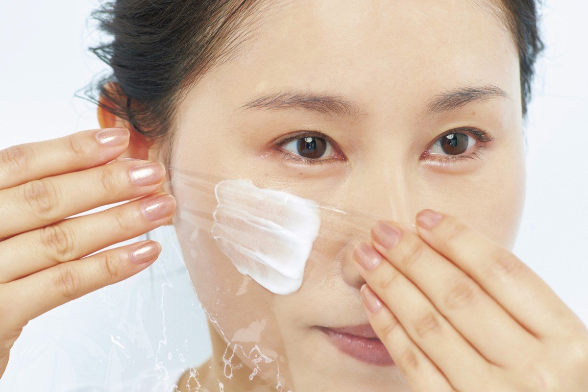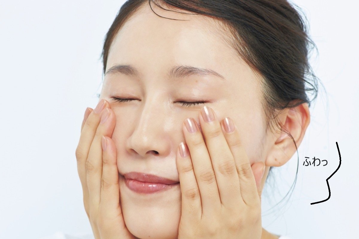 化粧水を手にたっぷりとり、指の力を抜いた「ふわっ」とした状態で顔全体を覆う。手のひら全体で丁寧に包み込むイメージで。