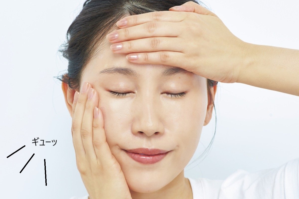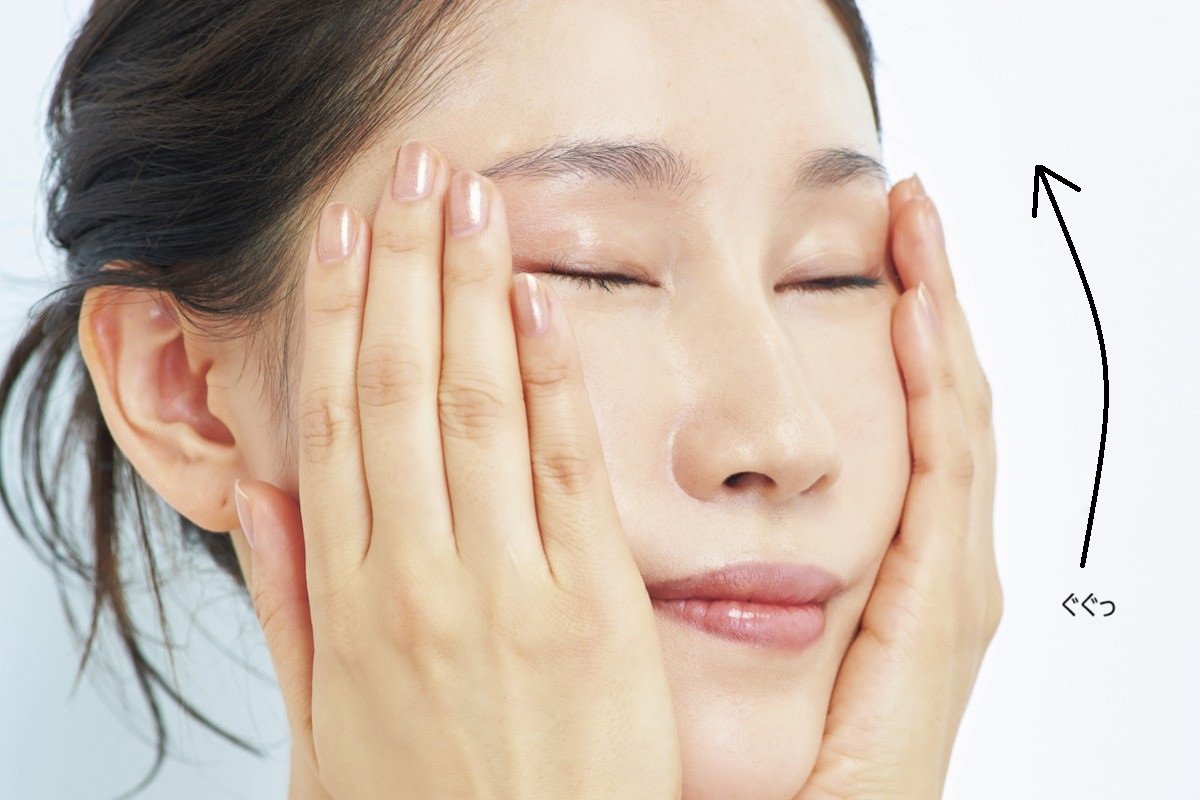 ぷるんとハリ肌に整えるコツは、指先まで肌の丸みにぴったり沿わせること。最後はぐぐっと引き上げてハリを記憶させる。