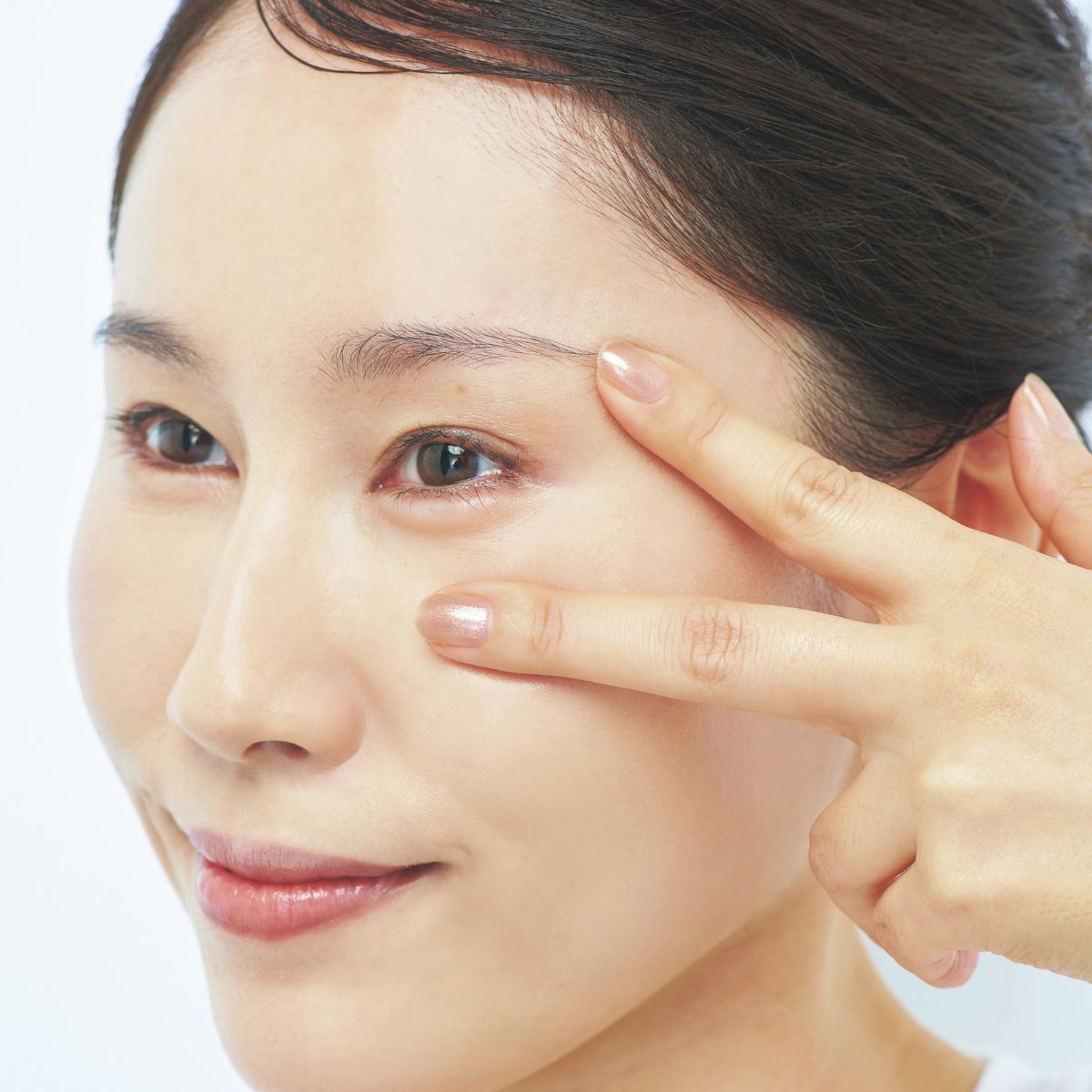 指を使った“ストレッチ塗り”がおすすめ。人さし指と中指でチョキを作り、目尻を軽く挟みながら指を広げてシワを引き伸ばします。その後アイクリームを重点的にオン! 指の腹を使いながらじっくり丁寧に浸透させていくことがポイントです。 物足りない部分へは重ね塗りして、さらに潤いをプラスして。