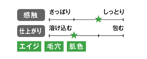 ウォーターベースでみずみずしい感触。肌あれ防止成分・グリチルレチン酸はじめ、各種アミノ酸や緑茶エキス、コメ発酵エキスなどの美容成分を配合。