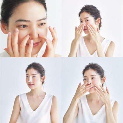毛穴詰まりの気になる部分を中心に、角栓洗浄コスメをなじませます。小鼻周りなど奥まっていて届きにくい部分は、鼻を逆側に倒して肌を伸ばし、くるくると。