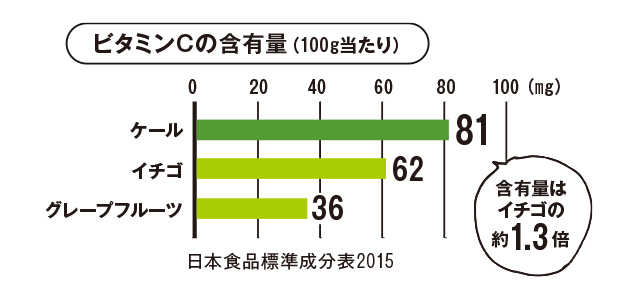 紫外線やストレスなどによって体内で発生する活性酸素を除去するのが〝抗酸化力〟。抗酸化力は、ポリフェノールやビタミンA(β-カロテン)、ビタミンC、ビタミンEなどに含まれていますが、それらの栄養素をまるっと摂取できるのがケール! とくにポリフェノール含有量は野菜の中でも群を抜いて多く、ビタミンA(β-カロテン)はトマトの約5倍、ビタミンEはキャベツの約24倍とかなり豊富で、まさに〝食べる美容液〟ともいえるほど。シミのもととなるメラニンの生成を抑える力を持つビタミンCも多く含んでいるので、透明感あふれる美肌づくりにももってこいの野菜です。体内で発生する活性酸素を防ぐ=飲む日焼け止め効果も期待できるいうコト!