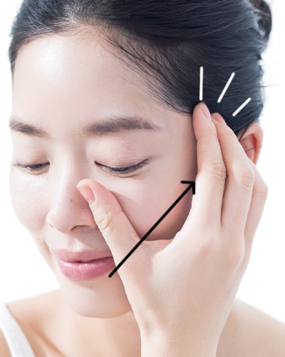 頬の毛穴は下を向いているもの。生え際を4本の指で引き上げながら親指で乳液を塗ると、たるんだ毛穴部分にもくまなく美容液を塗ることができる。