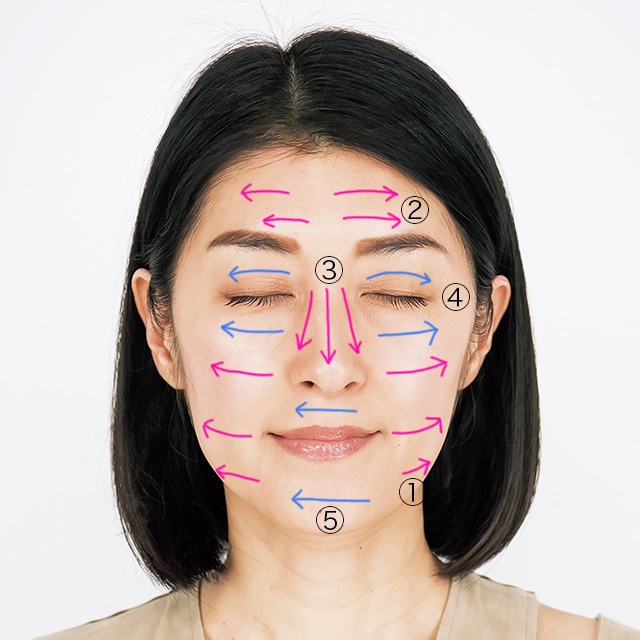 (1)コスメは、ムラなく塗布することが大切。顔を5つのパーツに分け、指を滑らせて丁寧になじませる。