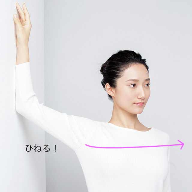 壁の横に立って、片手のひじから手のひらまでを壁につける。このとき、ひじは胸より上に上げ、さらに肩より前の位置に置くこと。