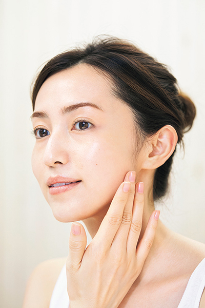 この季節は、肌あれやほてりを鎮静する成分入りの高保湿コスメをスタメンに。ダメージをいたわるように、優しい手つきでたっぷりなじませます。