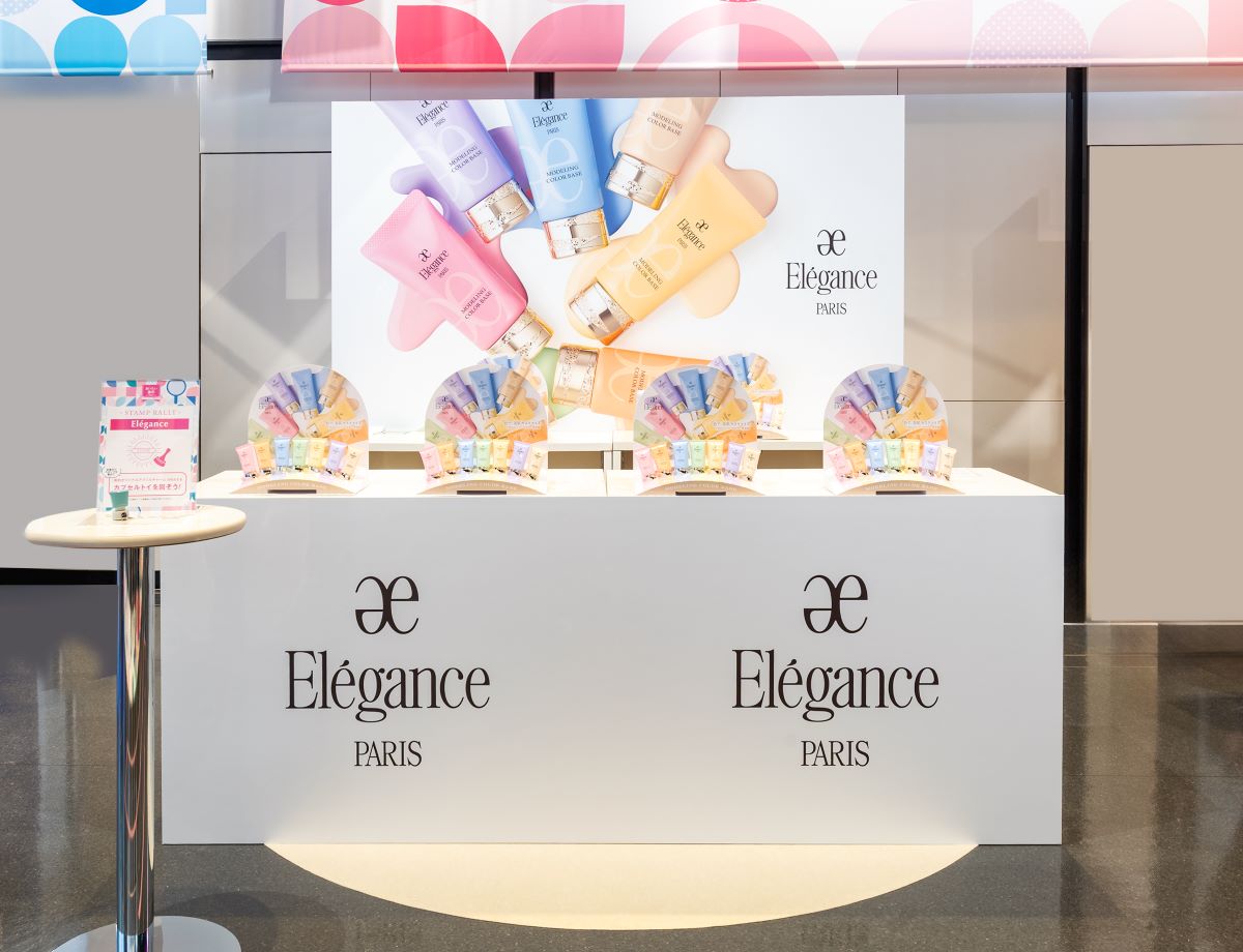 エレガンスのブースでは、9月に発売した肌色補正下地「モデリング カラーベース」をお試しできるということもあって2日間とも大賑わい。肌悩みや、なりたい肌印象に合わせておすすめの色をタッチアップをしてもらい、公式LINEの友達登録をすることで、全7色をお試しできるミニサイズの下地サンプルのプレゼントも。
