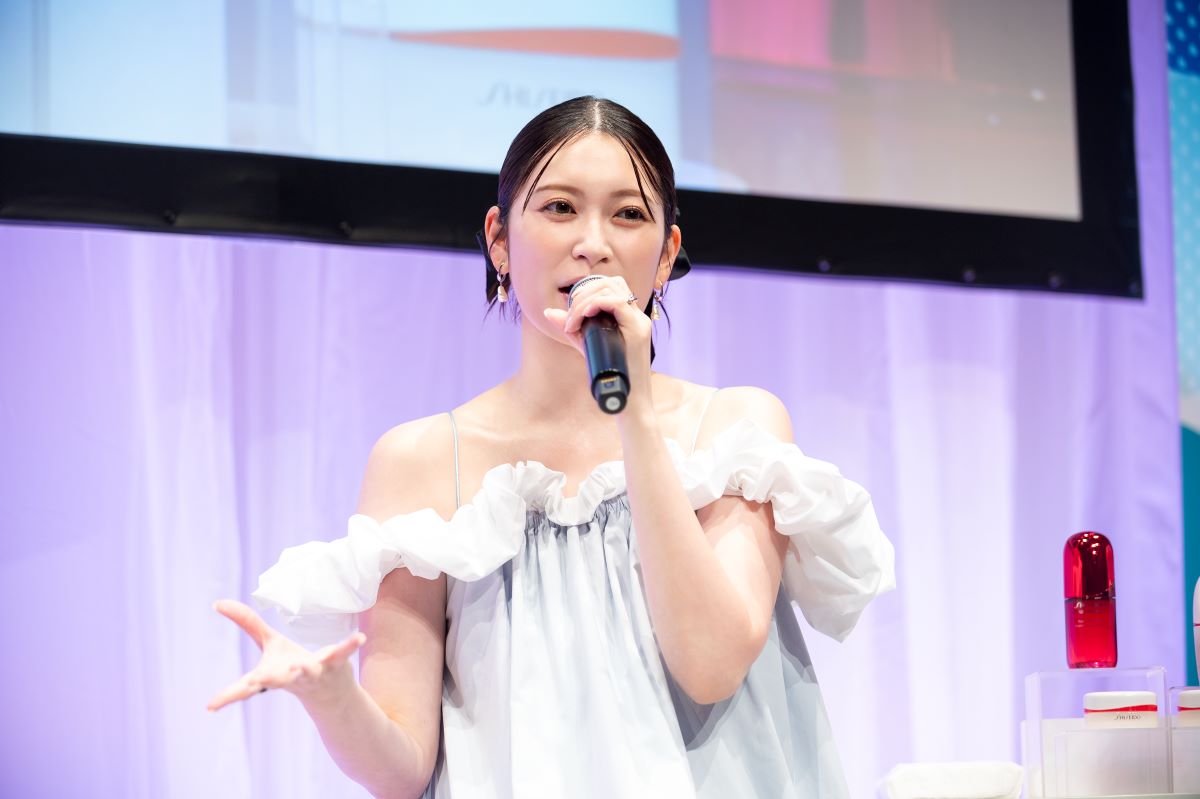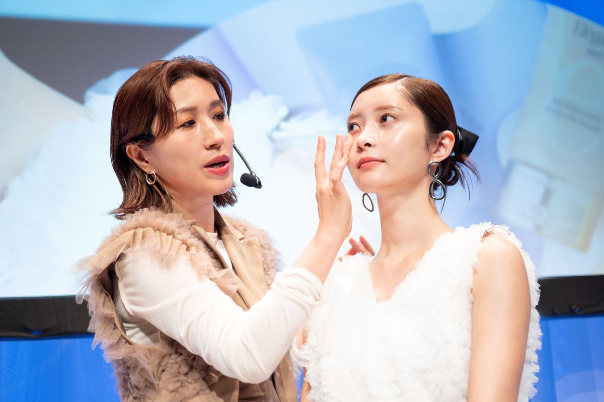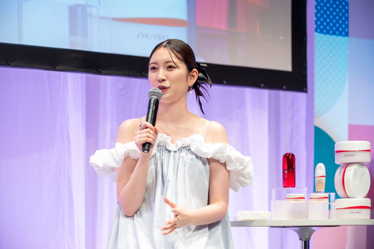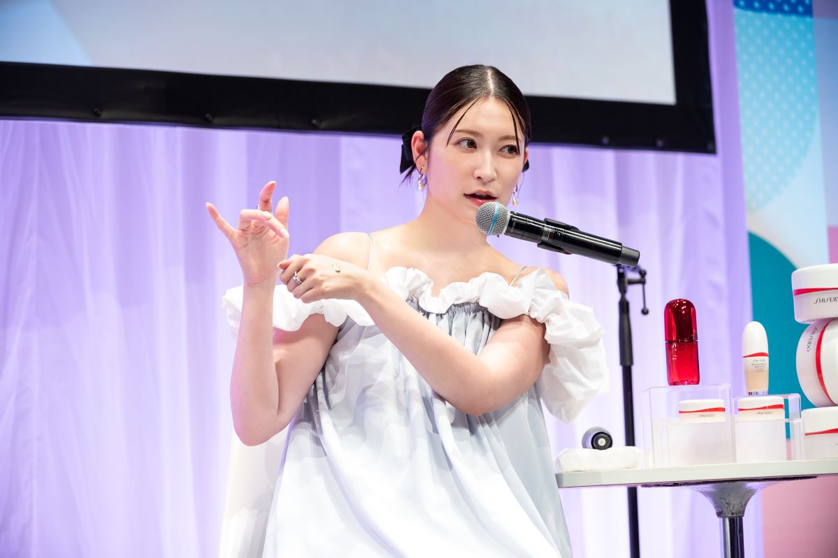 ベースメイクのレクチャーということで、すっぴん肌で登場した吉田さんを見て会場は驚愕。透き通るような美肌は、「SHISEIDO アルティミューン™ パワライジング セラム」を筆頭に作られているそう。この日は岡田さん指導のもと、ステージで披露した「エッセンス スキングロウ ファンデーション」を使ったベースメイク講座が開講!「このファンデは顔に5点おきして、広げるだけでOK。ヨレない、キレイに塗るコツなんてないんです。簡単なのに美肌になれるのがすごい。」と岡田さん。ファンデーションのあとは「SHISEIDO エッセンス スキンセッティング パウダー」に。パウダーは全顔にふわっとのせがちですが、顔の輪郭だけのせるというテクを披露。頬や鼻先のツヤ玉をいかしつつ、肌の品格をあげるためにベストな塗り方なのだそう。レクチャーを受けた来場者も一緒に実践する場となりました。