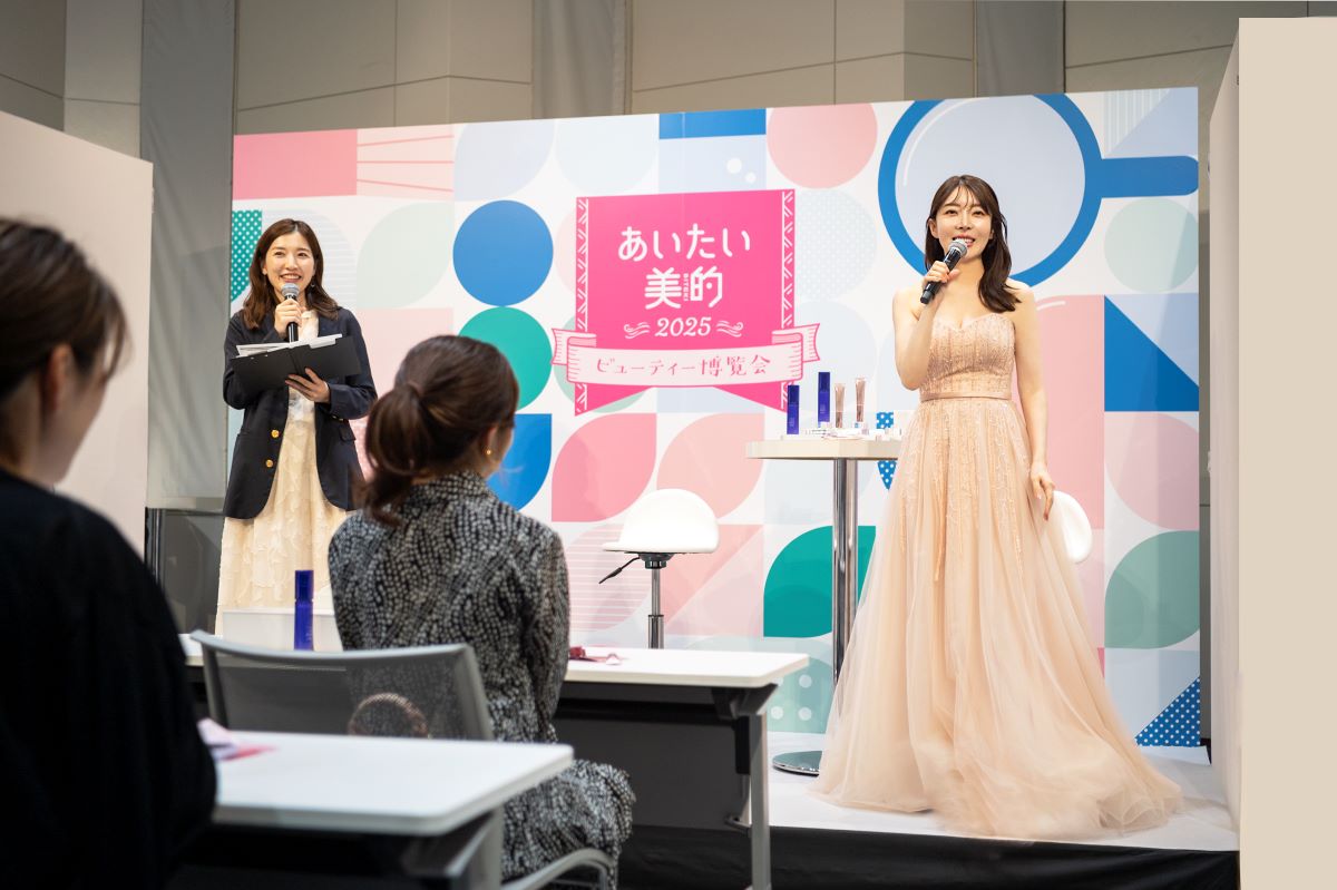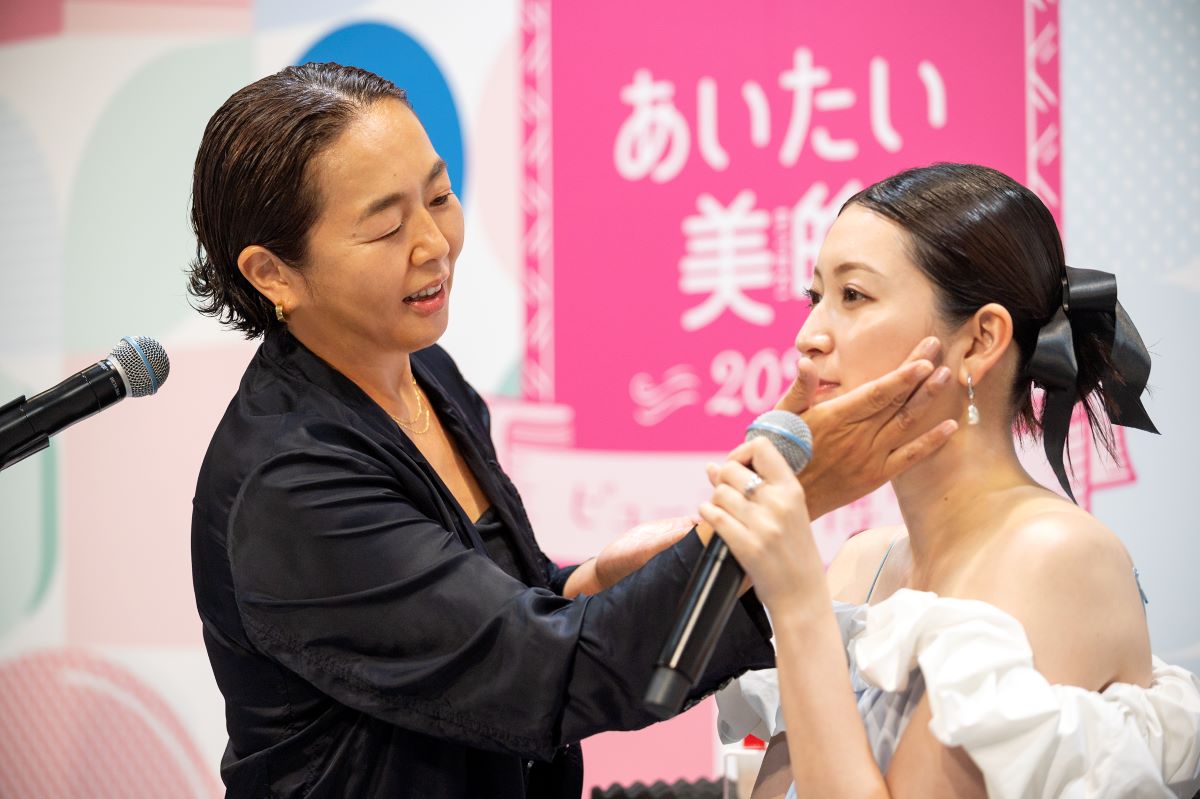 あいたい美的最初のステージに登場したのは、戦略的あざとかわいいビューティーの連載が話題の森香澄さんと思わず真似したくなるようなキュートなメイクで『美的』でもおなじみのヘア&メイクアップアーティストの夢月さん。プライベートでも親交のあるふたりは舞台上でも仲良しトークが止まりません!