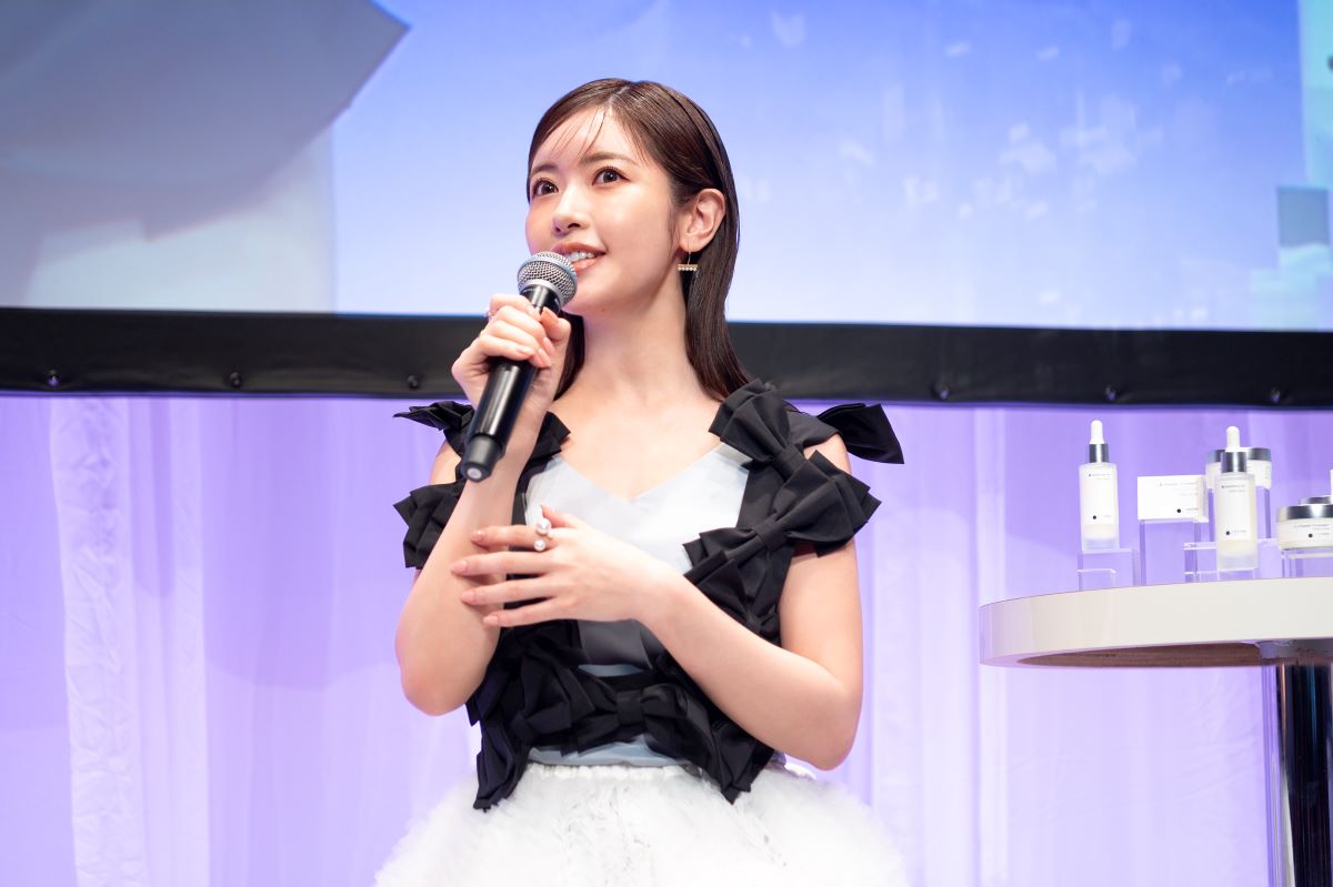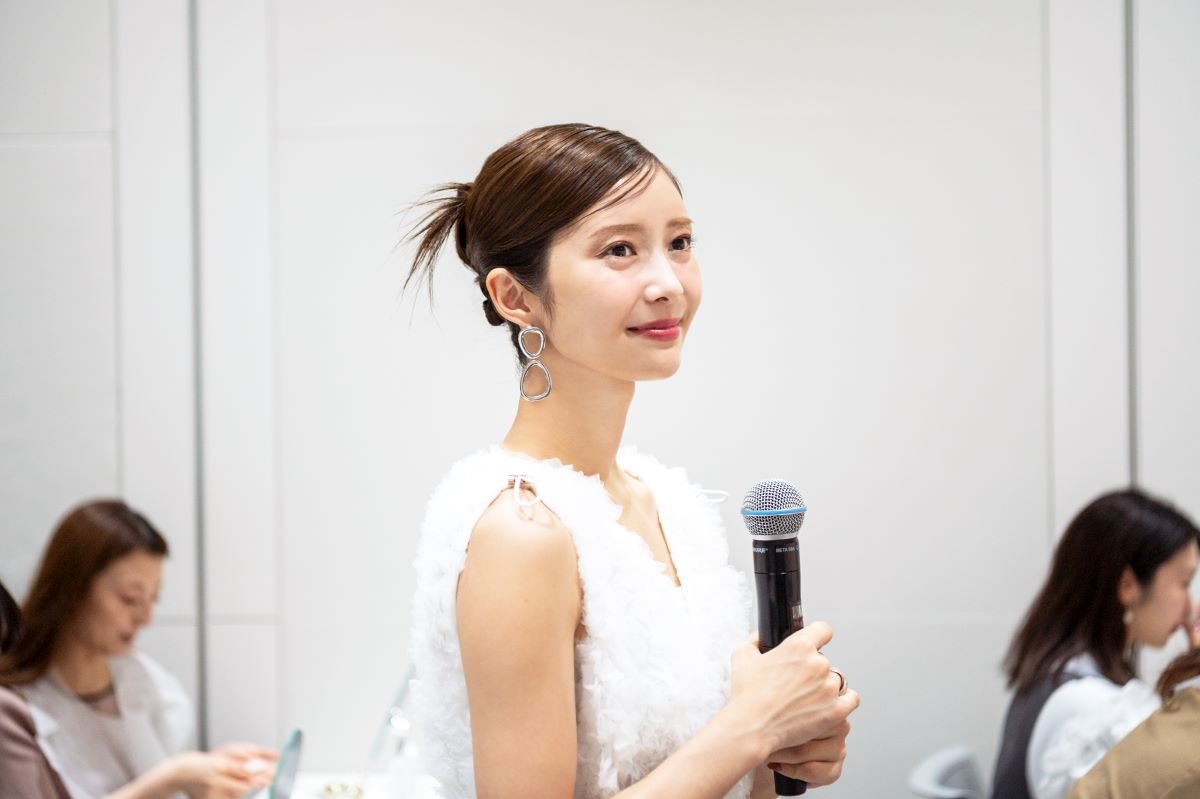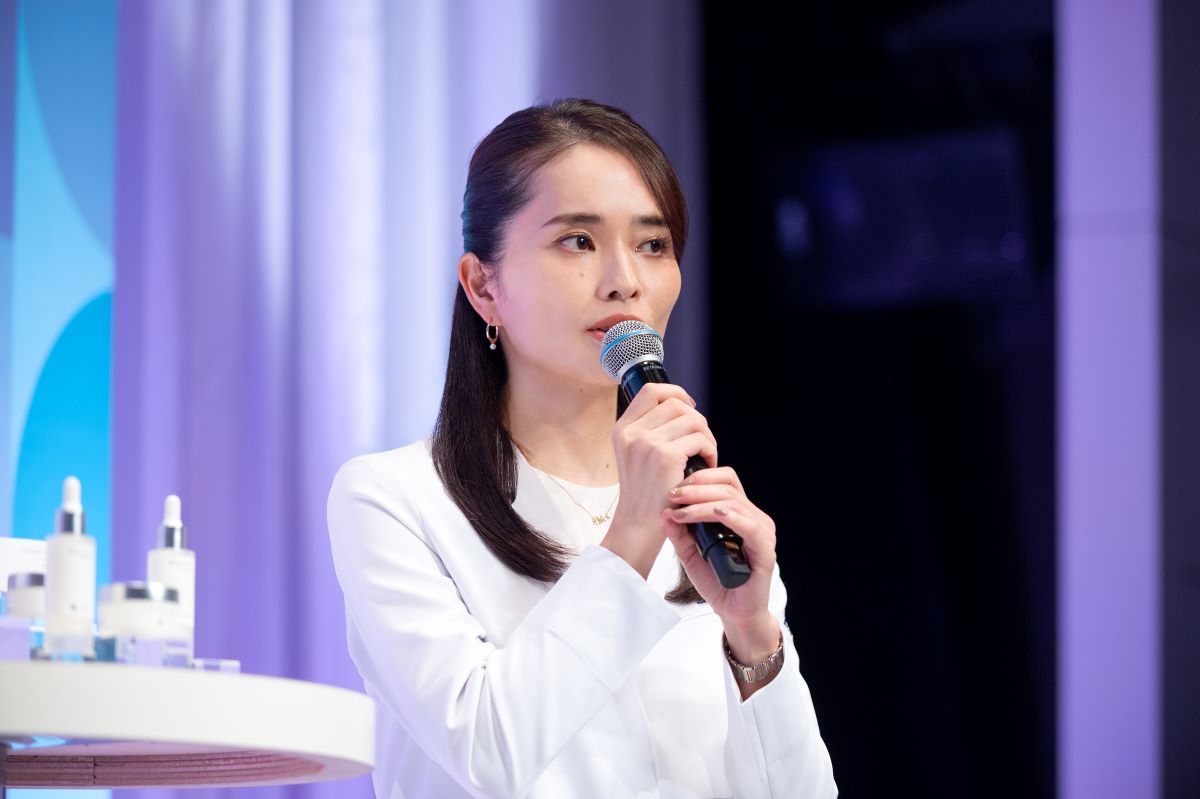 「これからの季節、寒いところに置いておいても指圧でなめらかにとろけて、使いやすい! 20代後半になって肌質が変わりはじめて来て、スキンケアを重視している中でこのクレンジングは会場の皆さんにもおすすめしたいアイテムです」(夢月さん)
