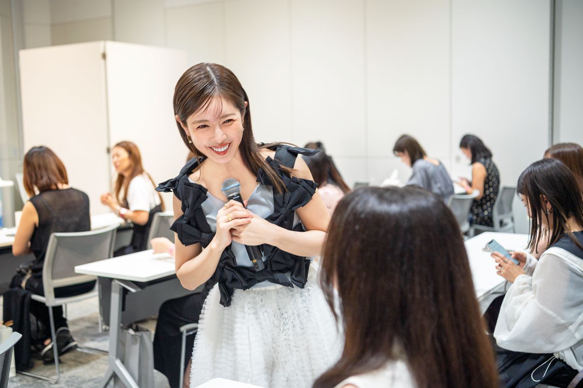 大野さんも実際に使ってみて、肌実感が早い! と感激。「シワ改善のクリーム状美容液というとテクスチャーが重めなものが多い中で、これはみずみずしいですね!」とコメント。顔はもちろん、首やデコルテまでしっかり塗ってレフ板のように自分を照らしてみて!と会場へ呼びかけました。