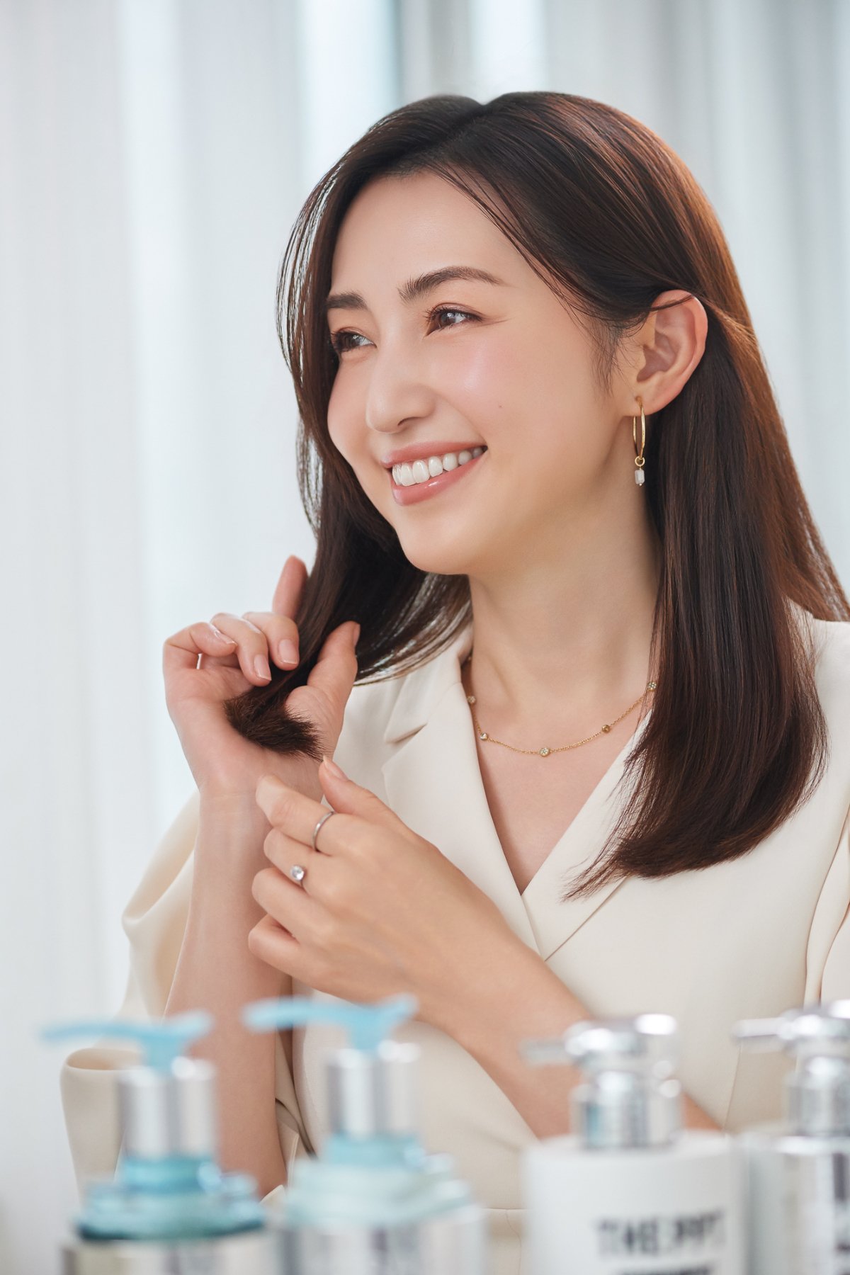 モデル・美容研究家 有村実樹(ありむら みき)さん/ 1986年生まれ。『美的』本誌の記事やインスタライブ、自身のInstagramアカウント(@arimura_miki)で公開する美容法や動画がわかりやすいと人気。プライベートでは2児の母。潤いとツヤ感に満ちた美しいロングヘアがトレードマーク。