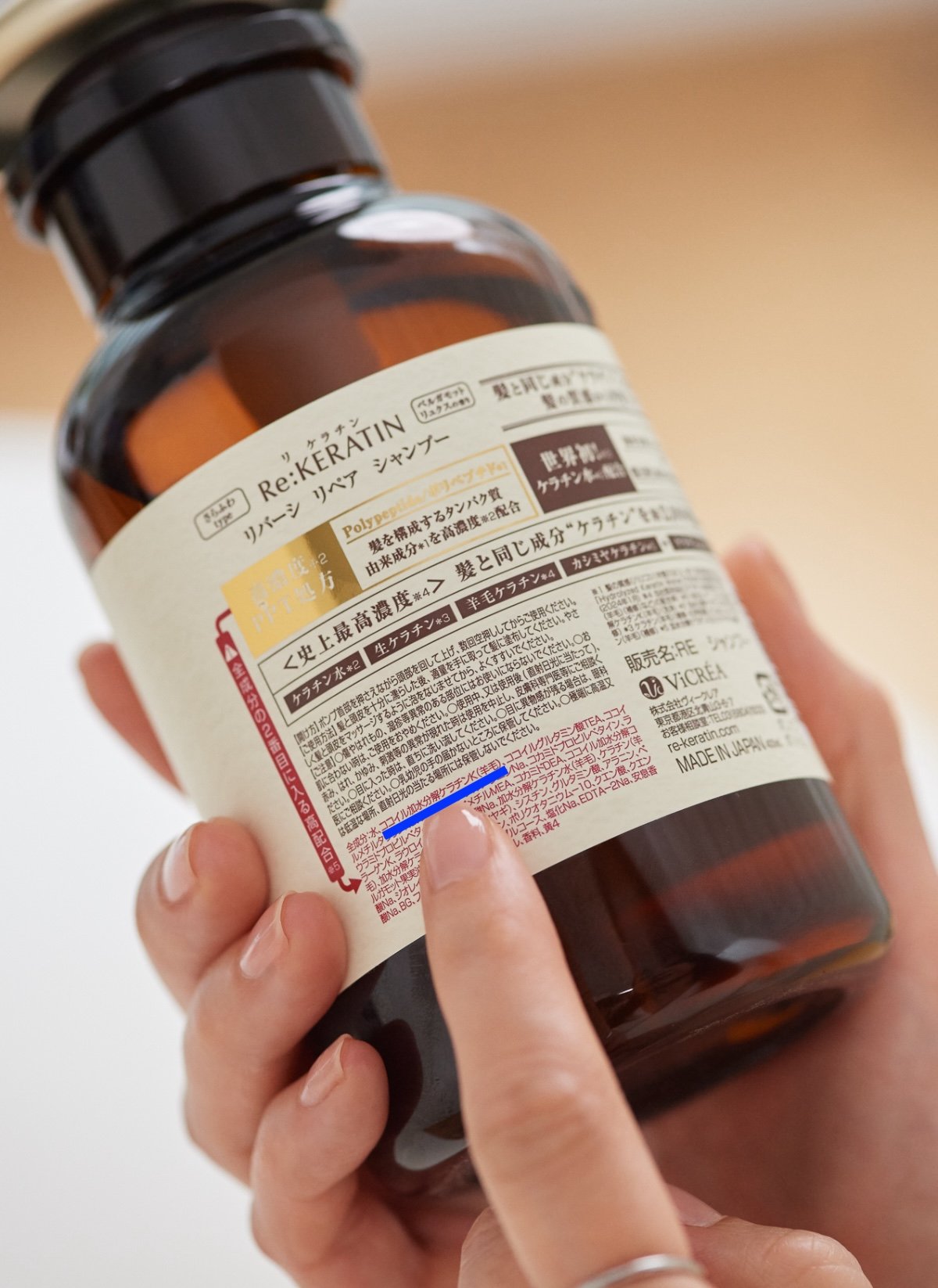shuco 実はあるんですよ! 特に今回お伝えしたいのはシャンプー。ヘアケアもスキンケアと同じで全成分表示は配合率の高いものから記載されるのですが、「Re:KERATIN」の全成分表示の2番目を見ていただくと「ココイル加水分解ケラチンK(羊毛)」と書かれていますよね? これはつまり、ケラチンPPTが高濃度配合されているということ。シャンプーを選ぶ際は全成分表示の「2番目」をチェックすると失敗しないと思います!