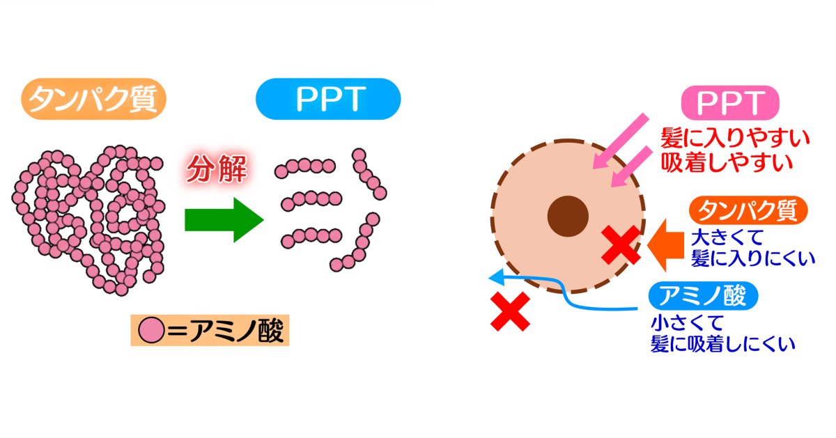 PPTとは髪の主成分であるタンパク質を、加水分解という化学反応を使って分子を小さくし、浸透性を高めたもの。「Polypeptide(ポリペプチド)」の頭文字をとってPPTと呼ばれている。