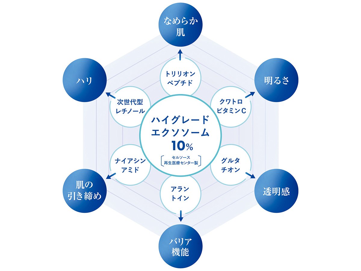 美容皮膚科医の監修の下、6つの理想をかなえるための美容成分を厳選して配合。ハイグレード エクソソームが肌の深部※3まで浸透して、満点の肌へと導く。