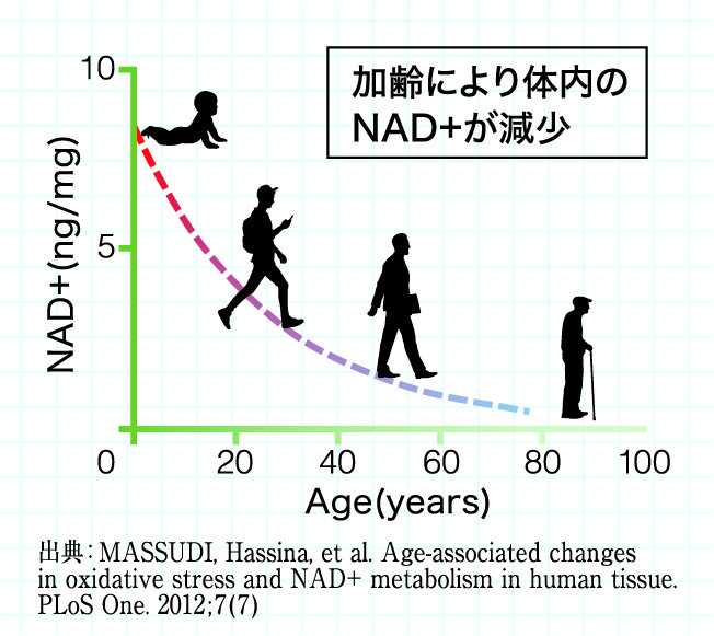「NMN」が注目されるのは、体内で重要な役割を担うNAD+と深く関係しているためです。NAD+はもともと人間の体内に存在する補酵素で、エネルギー産生や細胞のコンディション維持など、多くの生命活動に欠かせない存在。しかし、このNAD+は加齢とともに徐々に減少していきます。