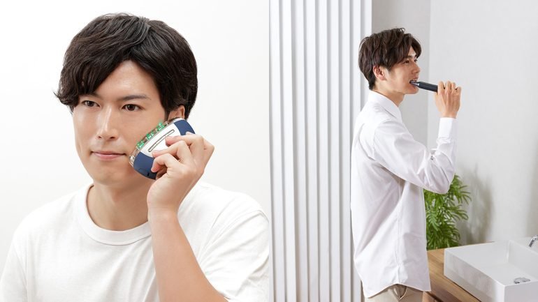 歯ブラシの背面にEMS電極が搭載されていて、電極から出力されるEMSが口腔内から筋肉を刺激するため、歯を磨きながら表情筋のケアが可能に。