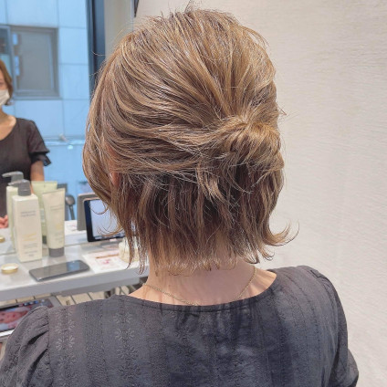 丸いトップが大人かわいいひとつ結びで結婚式の二次会へ