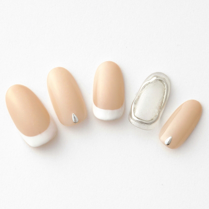 ホワイトベースに、薄いベージュとホワイトのマーブル模様を重ねた逆フレンチ。境目の…