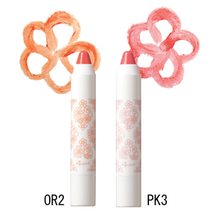 ローズヒップオイルを配合した、カサつきがちな唇にもスルスルのびるクリーミーな質感。OR2はクリアオレンジ、PK3はピュアピンク。