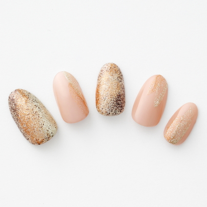 ピンクベージュをすべての指に一色塗りする。両手から2~4本ランダムに選び、ネイル…
