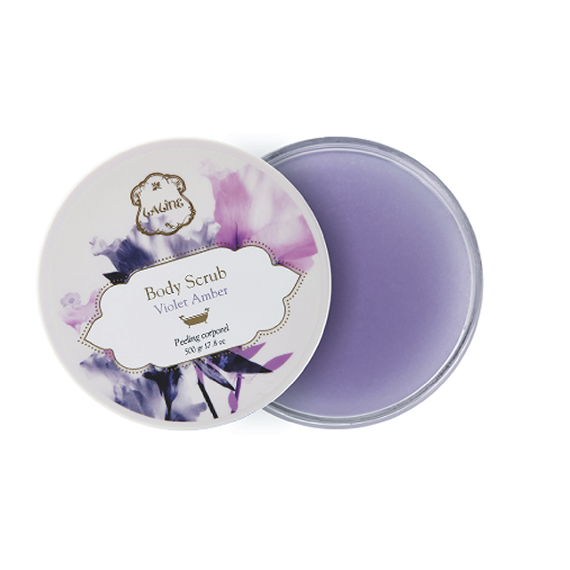 華やかなバイオレットの花柄がデザインされた、ボディケアアイテム。古い角質を優しくオフするオイルinスクラブ。