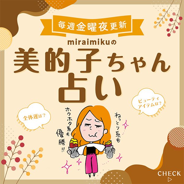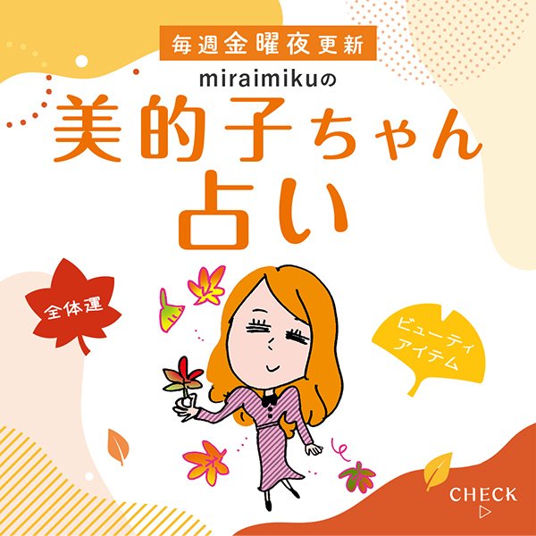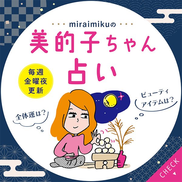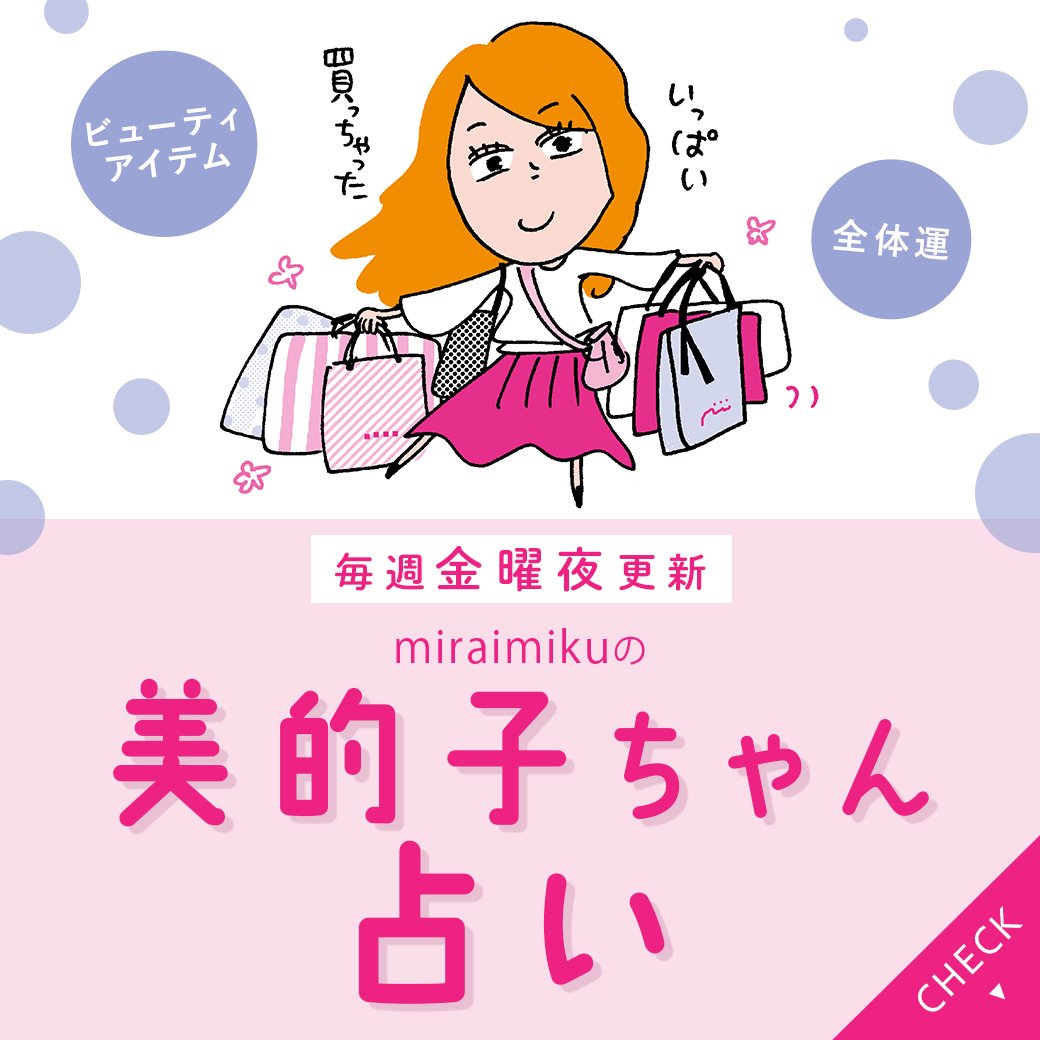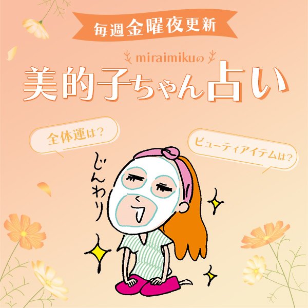金曜夜更新!読めばHAPPYになれる「美的子ちゃん占い」。占星術師・miraimikuさんによる12星座別占い&開運メッセージをお届けします。キレイになるヒントが満載のビューティメッセージも必読♡