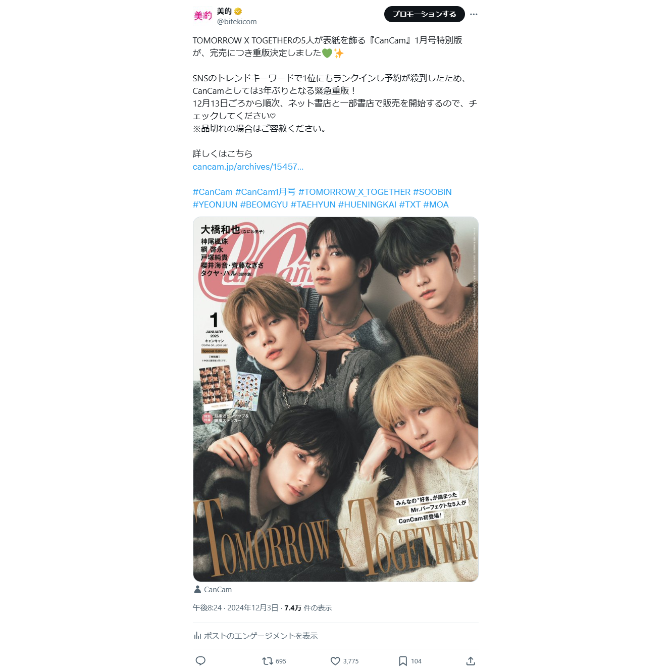 『美的』公式Xで話題になった情報をお届け!今週は『CanCan』1月号が重版決定、吉沢さんからのスペシャルメッセージに注目です。それではご紹介します♪ 第5位 …