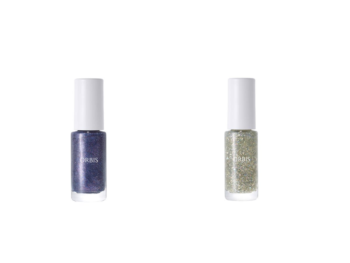 (写真左)星降る夜空を思わせる落ち着いた彩度のネイビーブルーカラー。ブルー、レッド、ゴールドの繊細なパールが贅沢に配合され、手肌に自然な血色感を与えつつ肌なじみもアップ。冬ならではのネイビーネイルが楽しめそう。