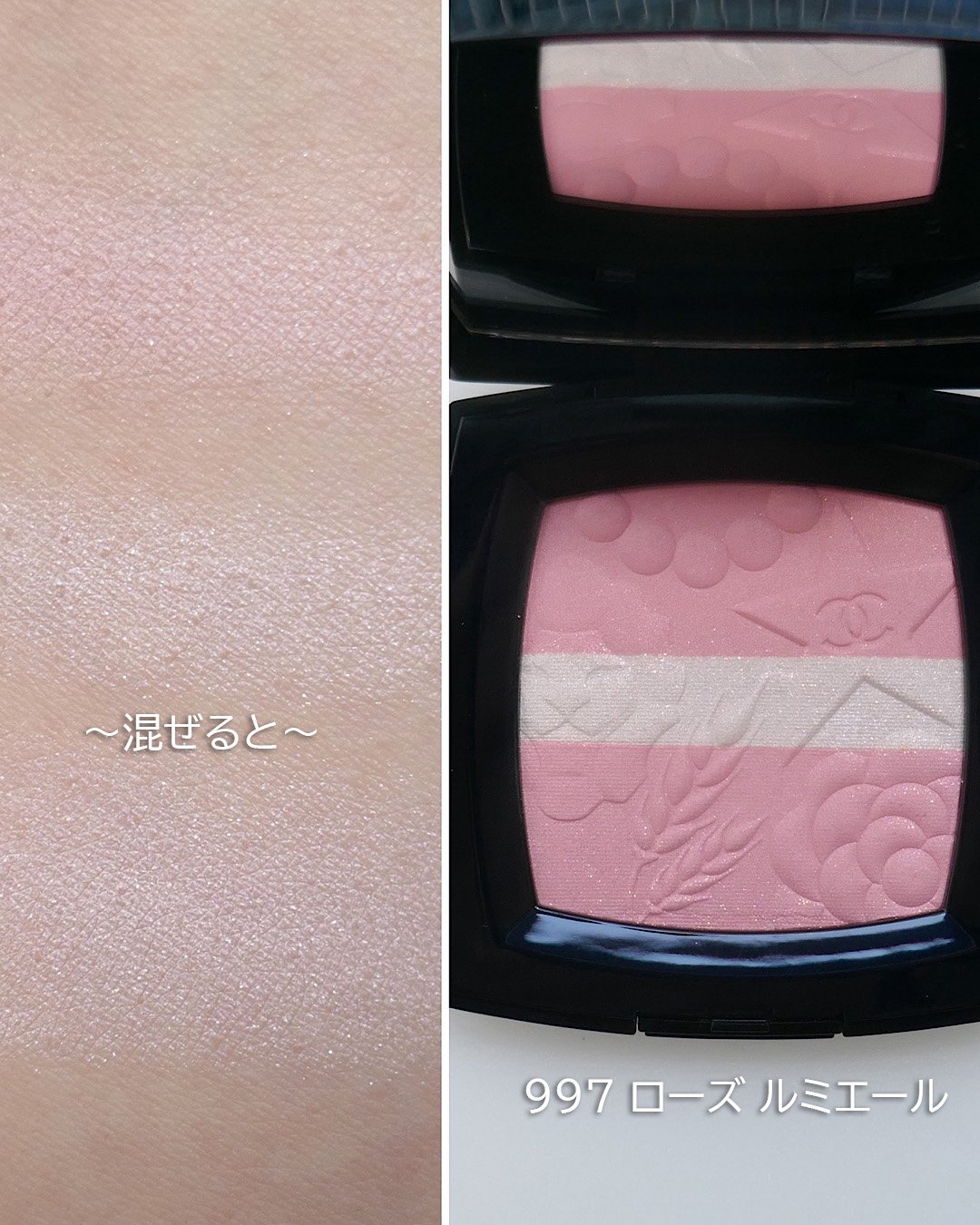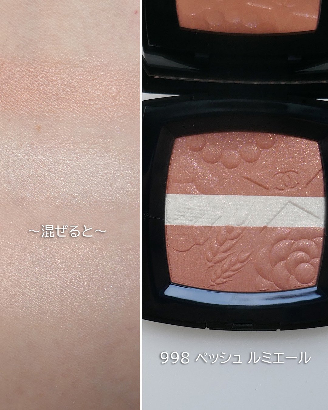 “997 ローズ ルミエール”はソフトな青みピンク×ホワイト ピンクのハイライターの組み合わせ。“998 ペッシュ ルミエール”はオレンジ ウッド×ホワイト ゴールド ハイライターの組み合わせ。