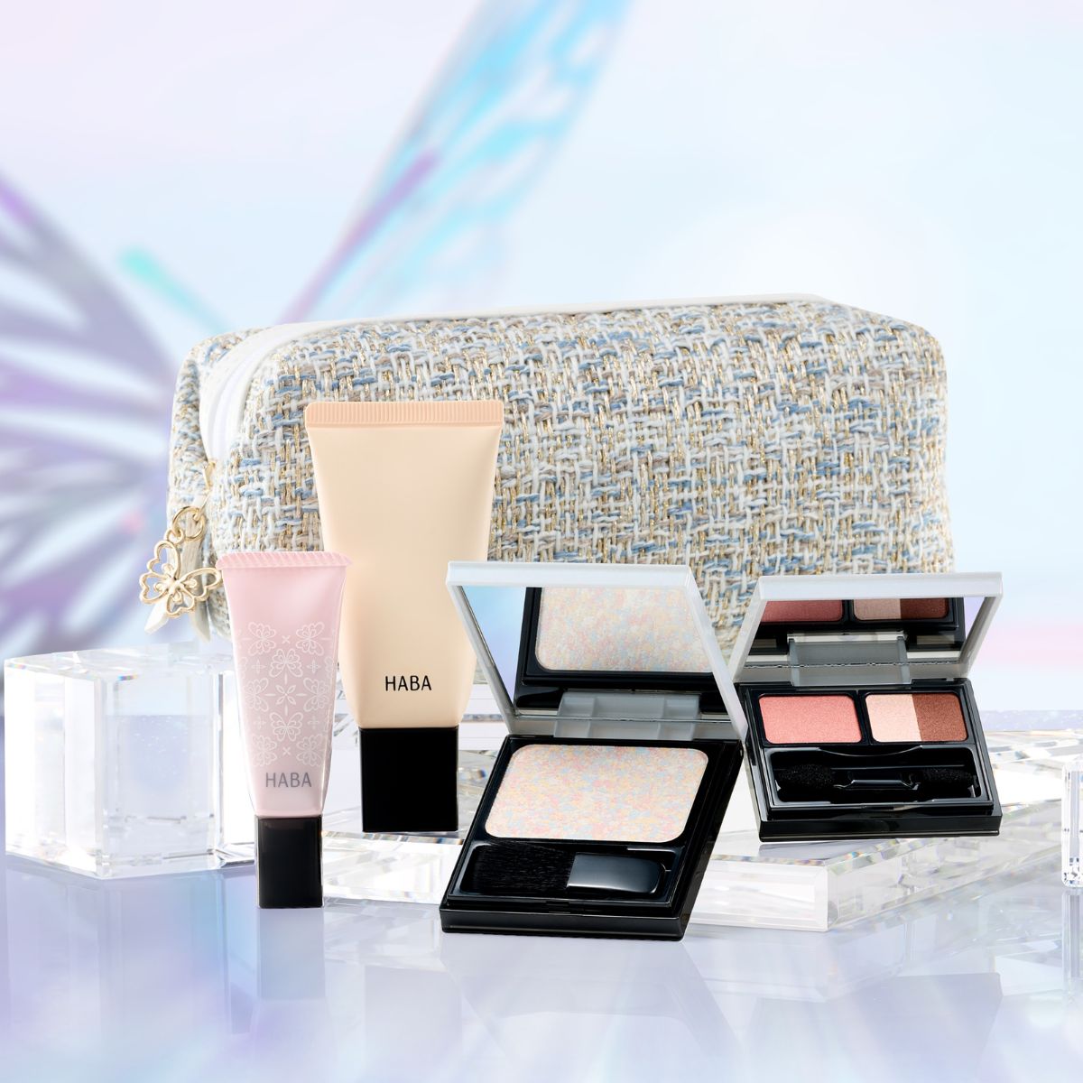 1本でベースメイクが完成する人気のBBクリーム「薬用スキンケアスクワ BB」の現品に加え、色ムラやくすみをカバーする4色のパウダーコンシーラー、蝶の美しい羽根をイメージしたアイカラーパレット、潤いのある唇に導くナチュラルローズの唇用美容液、ツイード生地のポーチをセットに。コンシーラー、アイカラー、リップには、光を拡散して内側から発光しているような自然なツヤと透明感を生み出す<パピヨンパール>を配合。重ねるほどに深みと奥行きが出る輝きを堪能して。