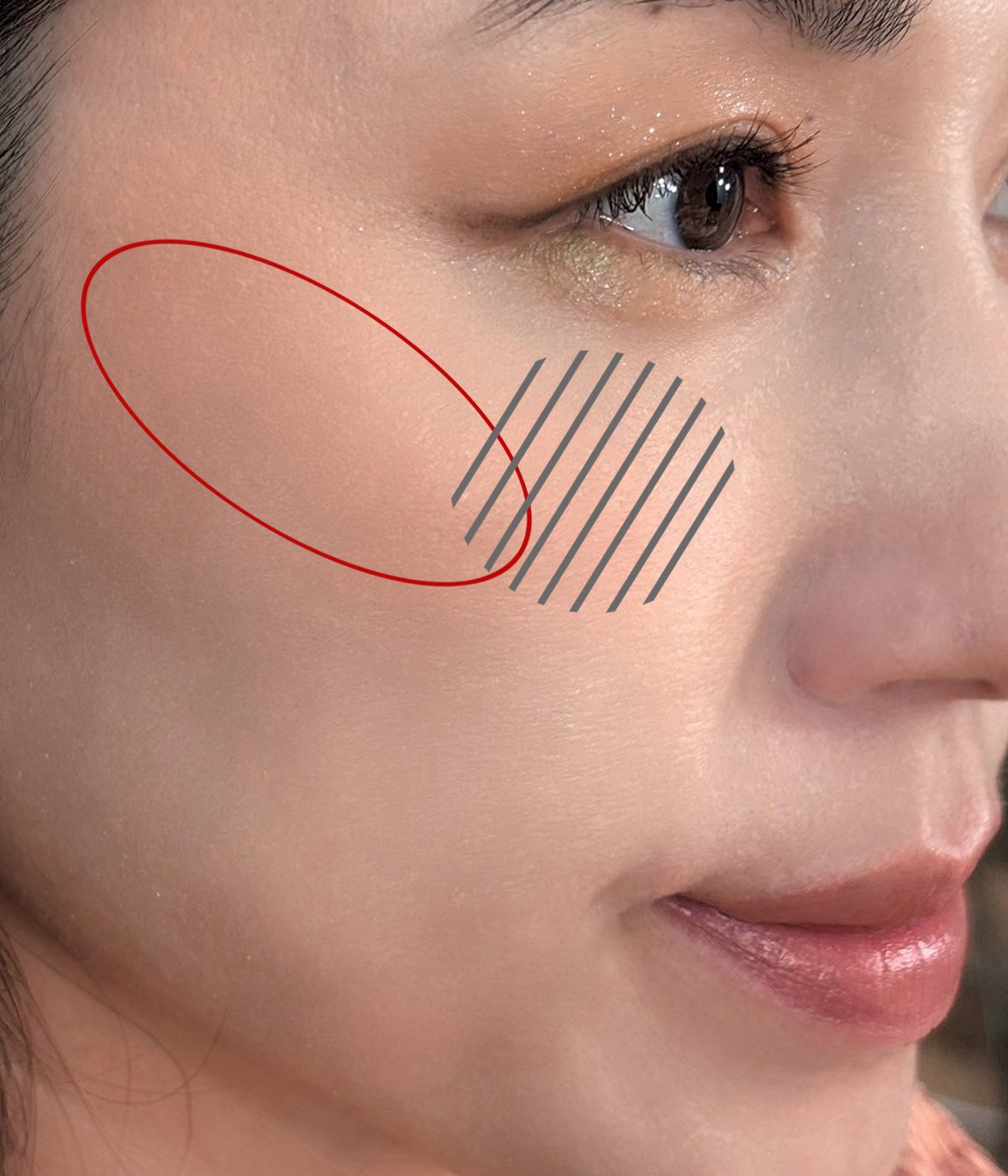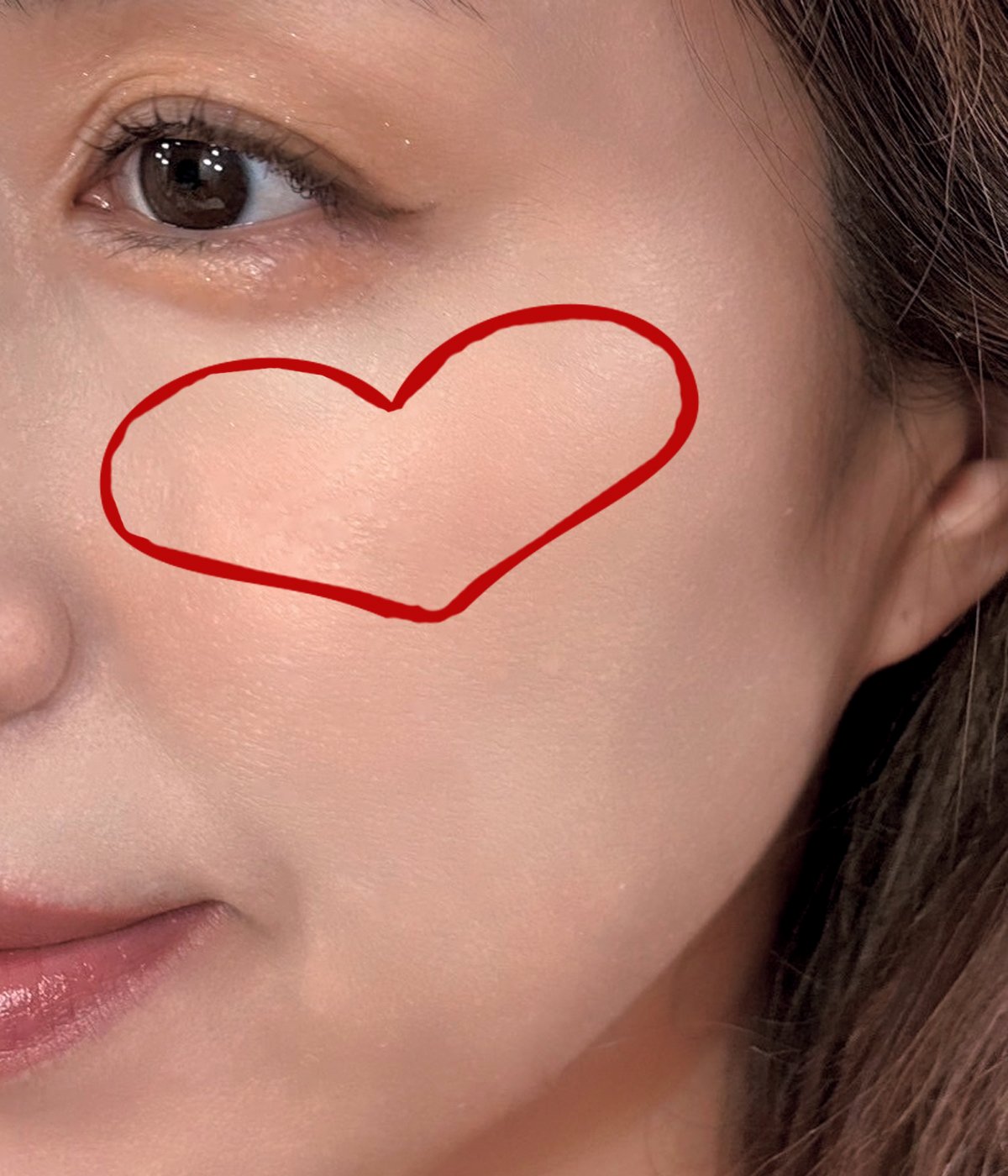 Aを頬中央に平たい♡形に入れると柔らかな印象。Fを頬中央から斜め上に、Aを中央に入れてなじませるとシャープでかわいい表情に。