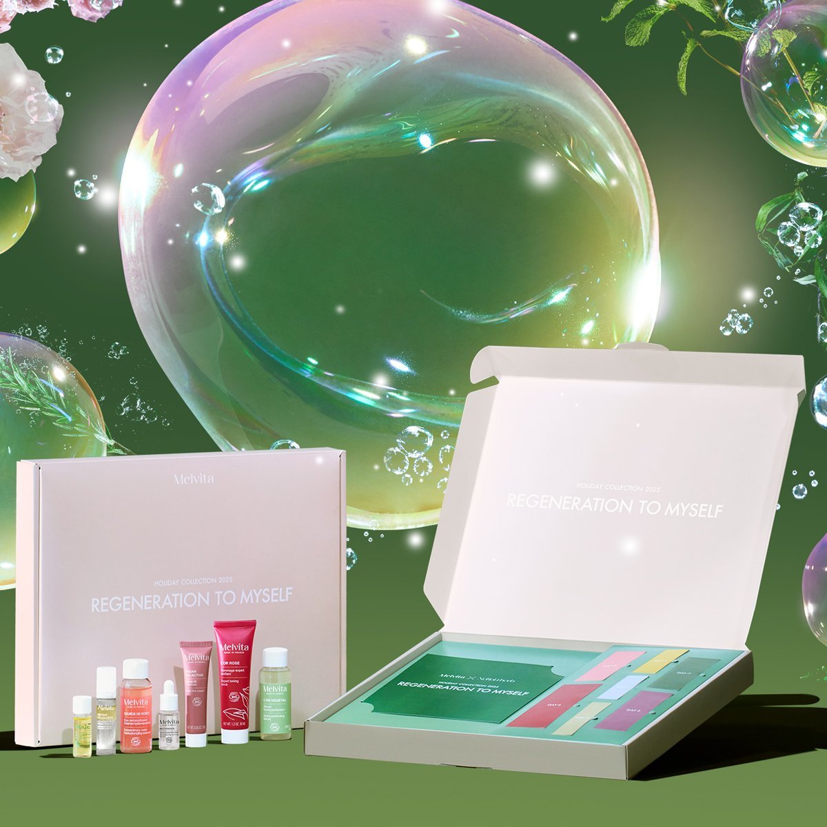 メルヴィータの植物の恵みを詰め込んだご褒美ケアアドベントカレンダー。アルガンオイルをはじめとする保湿&ブライトケアアイテム7品に、オーガニックハーブティーと読みものブックをセット。スキンケアと内側からのリラックスを同時に楽しめる構成が新鮮です。AHA・PHAを配合した導入美容液や、ローズ香る化粧水など、編集部も注目の名品ぞろい。1週間を通して“めぐり”と“潤い”を実感できるラインアップは、忙しい日々のセルフケアを格上げしてくれそう。自然の力を五感で味わう特別なカレンダーです。