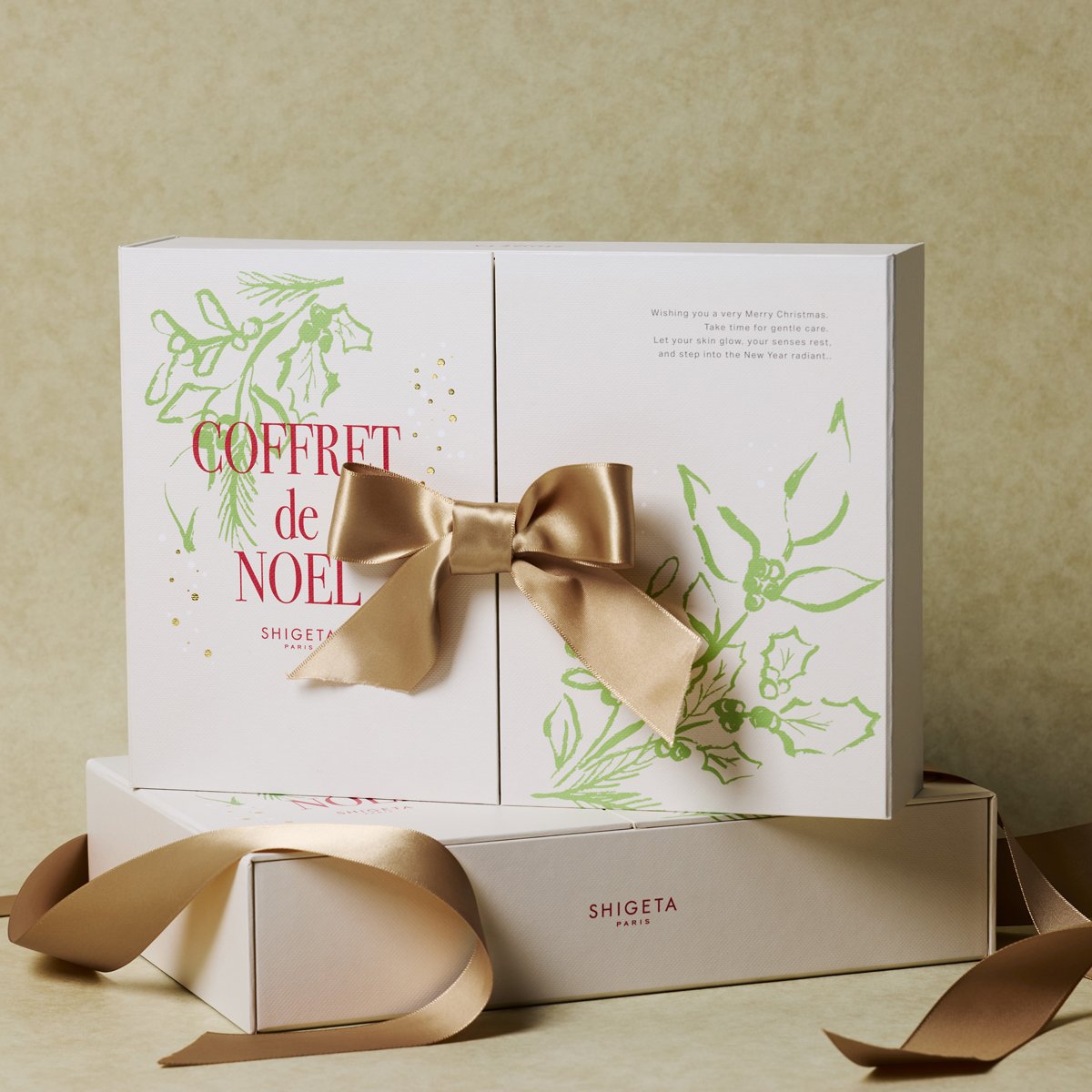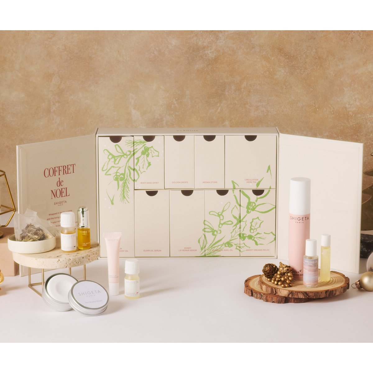 SHIGETAから人気アイテムを詰め込んだ待望のアドベントカレンダーが初登場!現品5点を含む豪華なラインアップは、ボディ・フェイス・リップまでを網羅。ハリやツヤを与えるオイルや美容液に加え、心を落ち着かせるアロマやハーブティーもセットされ、1日の終わりに深呼吸したくなるような心地よさをもたらします。ゴールドリボンをあしらったボックスは特別感たっぷり。自分を労わる“香りのギフト時間”を贈りたい人におすすめです。